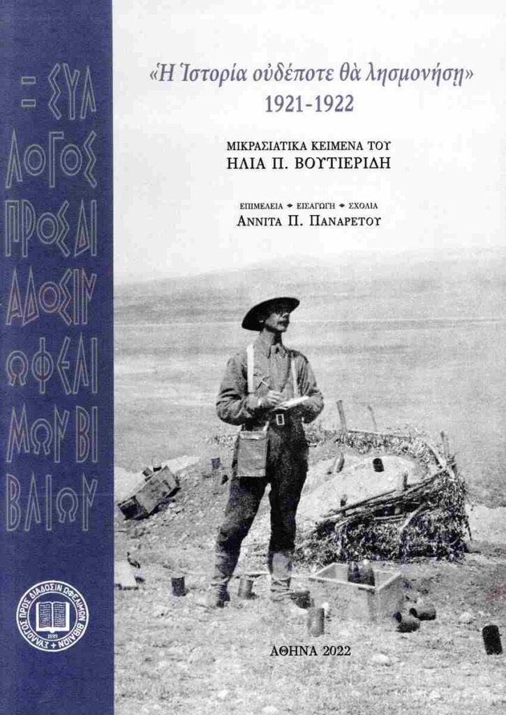 Ηλίας Π. Βουτιερίδης Η ιστορία ουδέποτε θα λησμονήση, 1921-1922 Επιμέλεια: Αννίτα Π. Παναρέτου εκδ. Σύλλογος προς Διάδοσιν Ωφελίμων Βιβλίων, 2022, σελ.: 424, τιμή: 22,00 € Φιλόλογος, γραμματολόγος, κριτικός και ιστορικός λογοτεχνίας, δημοσιογράφος, λογοτέχνης, θεατρικός συγγραφέας o Ηλίας Βουτιερίδης (1874-1941) δοκιμάστηκε σε όλα τα είδη του λόγου, άφησε ένα εκτεταμένο και σπουδαίο στην πολυμέρειά του έργο. Ευρύτερα… Read More